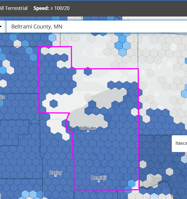 Screenshot 2025-11-28 114947 Published November 28, 2025 at 622 × 663 in How does the NATIONAL Broadband map rank your MN county for broadband access to 25 Mbps down and 3 Mbps up? (2025) Beltrami County (National Map)
