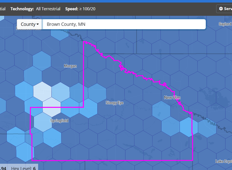 Screenshot 2025-11-28 115327 Published November 28, 2025 at 925 × 678 in How does the NATIONAL Broadband map rank your MN county for broadband access to 25 Mbps down and 3 Mbps up? (2025) Brown County (National Map)