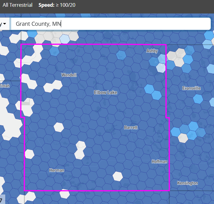 Screenshot 2025-11-28 120813 Published November 28, 2025 at 696 × 665 in How does the NATIONAL Broadband map rank your MN county for broadband access to 25 Mbps down and 3 Mbps up? (2025) Grant County (National Map)