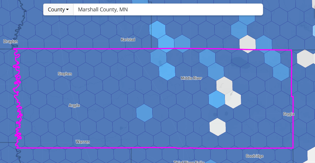Screenshot 2025-11-28 122512 Published November 28, 2025 at 1080 × 560 in How does the NATIONAL Broadband map rank your MN county for broadband access to 25 Mbps down and 3 Mbps up? (2025) Marshall County (National Map)