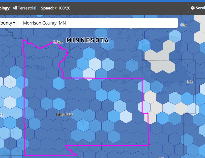Screenshot 2025-11-28 122908 Published November 28, 2025 at 839 × 650 in How does the NATIONAL Broadband map rank your MN county for broadband access to 25 Mbps down and 3 Mbps up? (2025) Morrison County (National Map)
