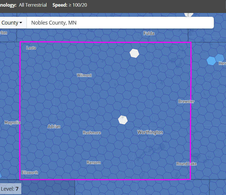 Screenshot 2025-11-28 123215 Published November 28, 2025 at 785 × 676 in How does the NATIONAL Broadband map rank your MN county for broadband access to 25 Mbps down and 3 Mbps up? (2025) Nobles County (National Map)